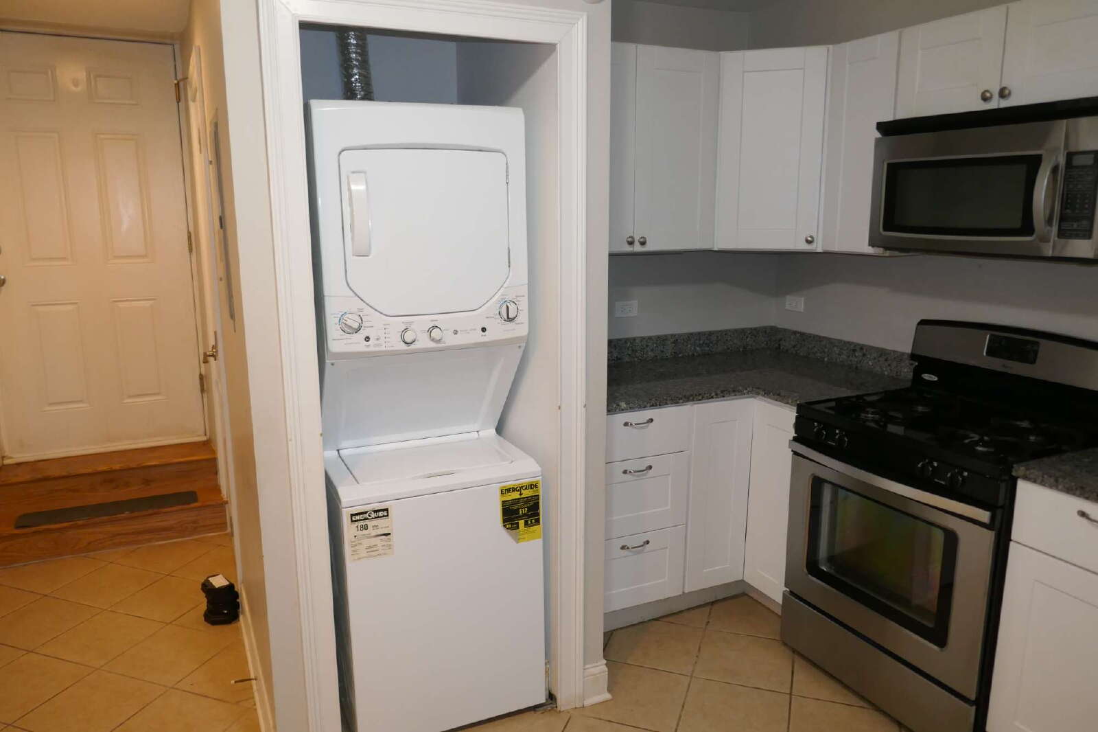 Clean newly remodelled and spacious 2 bedroom 2 bath ground level appartment with in unit laundry.A modern updated kitchen with stainless steel appliances and updated bathrooms. Unit has central air and one parking spot in fenced yard.